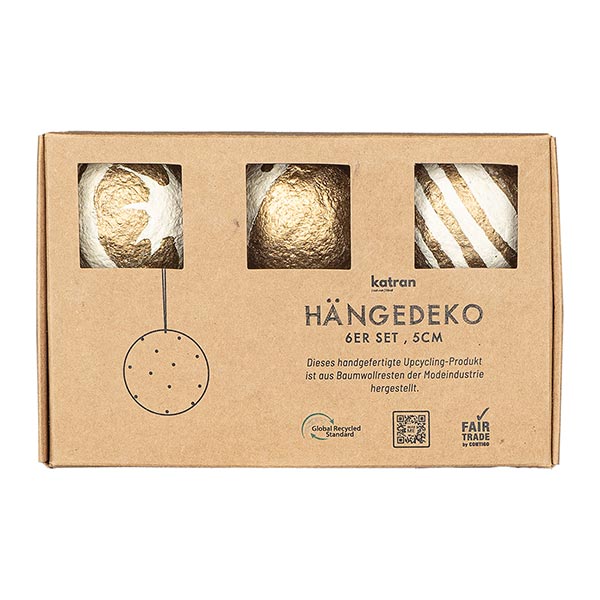 Mit viel Detailliebe handbemalte, dekorative Anhänger im 6er Set. Das Besondere: Baumwollreste, die als Abfall in der Textilherstellung anfallen, werden zu einer Art Pappmaché, genannt Katran, gepresst. So entsteht ein einzigartiges Upcyclingprodukt.