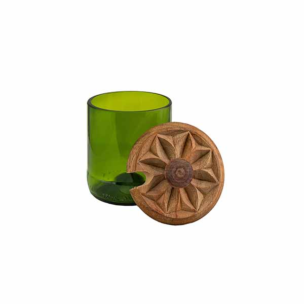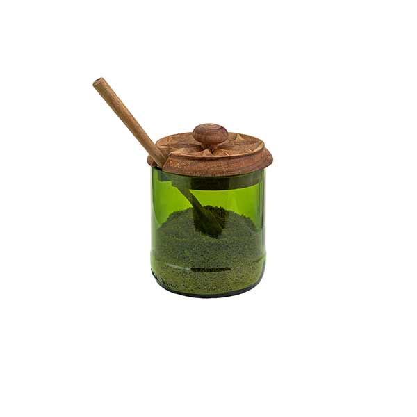 Hübsches Gefäß mit kunstvoll geschnitztem Holzdeckel (Mninga) mit Aussparung für einen Löffel, hergestellt aus recycelter Weinflasche, handgefertigt auf der Insel Sansibar, Tansania.