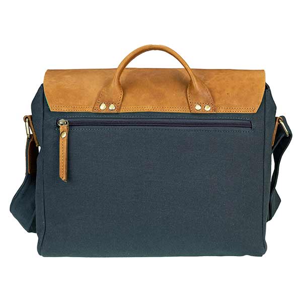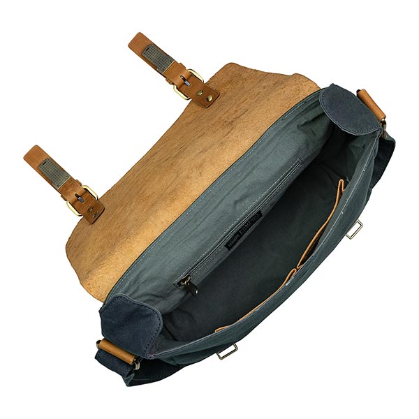 Sportliche Schultertasche aus griffigem Bio-Canvas mit Klappe aus Vollleder. Das praktische Messenger-Format ist geeignet für A4 Dokumente und Zeitschriften, die durch die Rainflaps vor Regen geschützt sind.
