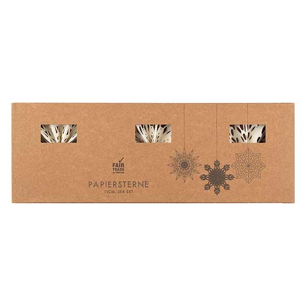 Dekoratives 3er Set von Papiersternen in Form einzigartiger Schneeflocken. Ein auffälliger Raumschmuck, der Weihnachtsstimmung ins Haus bringt. Er eignet sich besonders als Hingucker am Weihnachtsbaum oder als Deko an einzelnen Zweigen.