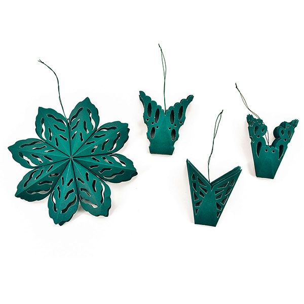Dekoratives 4er Set Faltsterne aus Papier in Form kleiner Schneeflocken. Ein auffälliger Raumschmuck der Weihnachtsstimmung ins Haus bringt. Er eignet sich besonders als Hingucker im Fenster oder als Deko an einzelnen Zweigen.