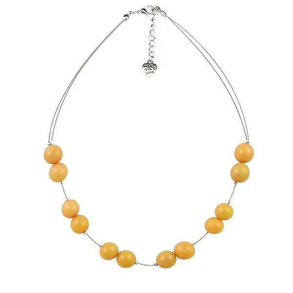 Sommerliche Halskette mit Perlen aus den Samen der philippinischen Buri-Palme. Unser langjähriger Handelspartner SHINE widmet sich der Herstellung von Schmuck aus lokal verfügbaren Naturmaterialien. Die Buri-Palme blüht nur einmal gegen Ende ihres Lebens (nach etwa 70 Jahren) und bildet danach den weltweit größten Fruchtstand mit mehr als 10.000 Samen. Nach der Ernte werden diese zu hübschen Perlen weiterverarbeitet.