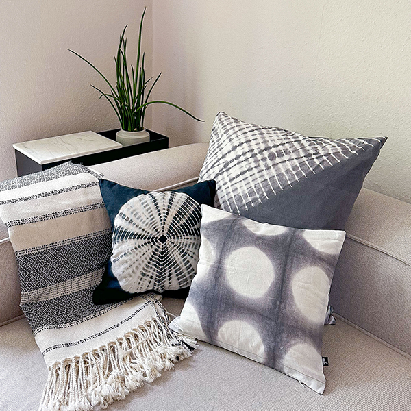 Handarbeit vom Feinsten steckt in diesem Wendekissen. Der Baumwollstoff wird von Hand gewoben, das aufwändige Muster entsteht in einem Batikverfahren, das traditionell aus Japan kommt. Bei dieser Shibori-Technik werden die Stoffe gefaltet, abgebunden oder abgenäht. Dadurch werden nach dem Färben helle Muster sichtbar. Je nach Art der Faltung und Abbindung, sowie der Stärke des Zusammendrückens, gelangt die Farbe an diesen Stellen nicht in den Stoff. So wird jedes Stück zum einzigartigen Kunstwerk.