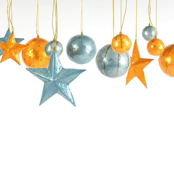 Material: Pappmachématerial aus alten Zeitungen, Bruchstücke der Capizmuschel (Placuna placenta), mit Kunstharz überzogen, mit goldenem Bändchen zum Aufhängen