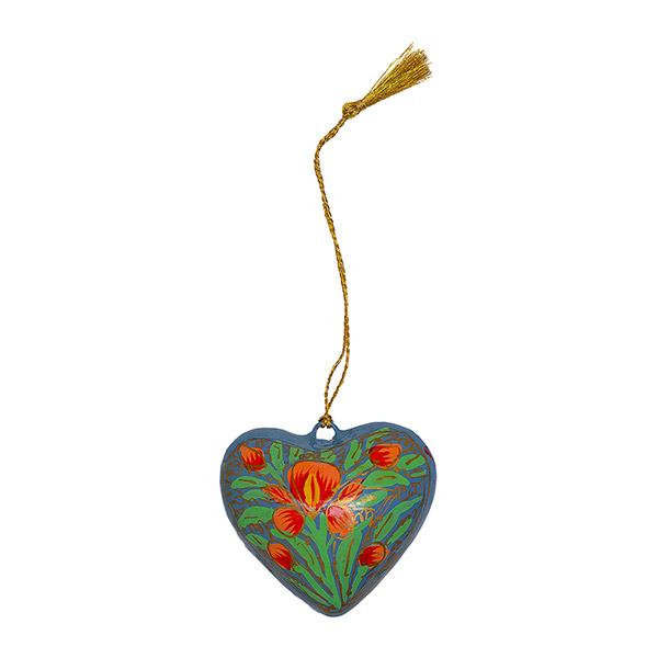 Dekorativer Weihnachtsbaum- oder Strauchschmuck aus Pappmaché, aufwändig handbemalt in bunten Farben und detailverliebten Mustern von dem kleinen Familienbetrieb Jalaluddin in der Region Kaschmir in Nordindien.