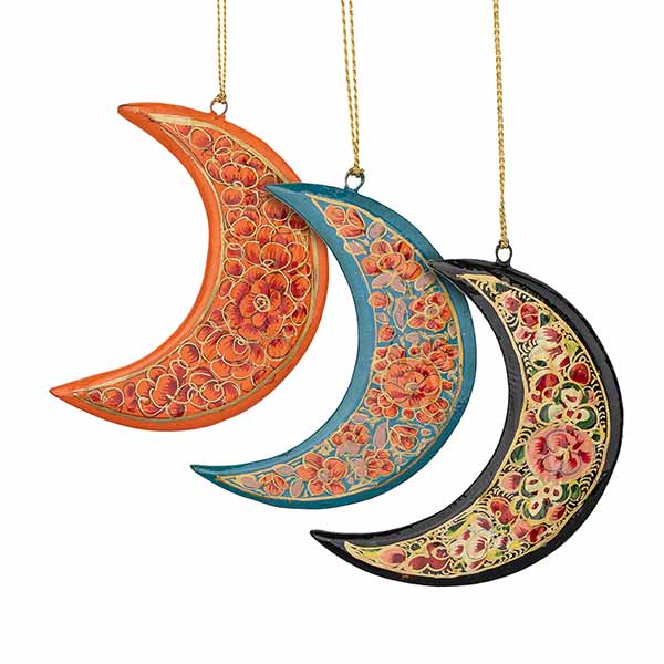 Für einen Hauch von 1001 Nacht im heimischen Wohnzimmer. Die Monde sind aus Pappmaché und handbemalt in bunten Farben und vielfältigen Blumenmustern. Sie werden vom kleinen Familienbetrieb Jalaluddin in der Region Kaschmir in Nordindien hergestellt. Toll für den Weihnachtsbaum, aber auch eine zauberhafte Deko für den Rest vom Jahr, zum Beispiel im Fenster.