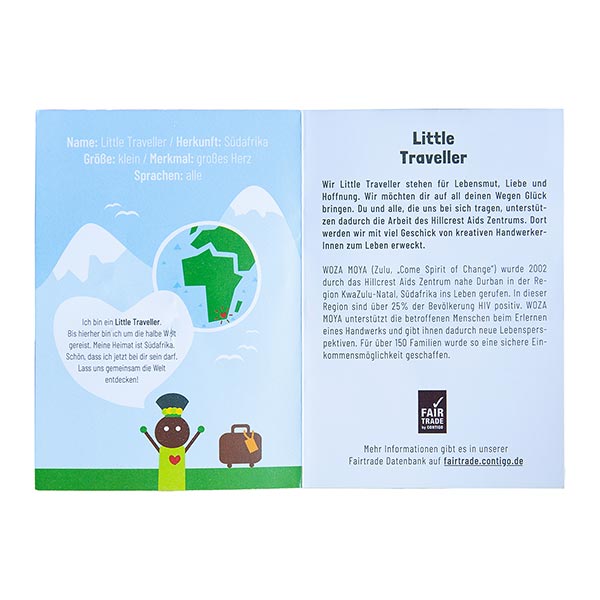 Kleine Püppchen mit großer Wirkung: Die "Little Traveller" werden von geschickten Perlenknüpfern hergestellt, die von HIV / Aids betroffen sind. Durch den Verkauf ihrer Produkte werden ihnen Einkommensmöglichkeiten eröffnet und damit Würde zurück gegeben. Die Püppchen sind Ausdruck von Hoffnung, Perspektive, Lebensmut und Verbundenheit zwischen den Menschen verschiedener Kontinente. Mit dem Kauf der kleinen Mutmacher unterstützt Du die umfangreiche Arbeit der 1991 gegründeten NGO "Hillcrest Aids Center Trust" in Durban / Südafrika.