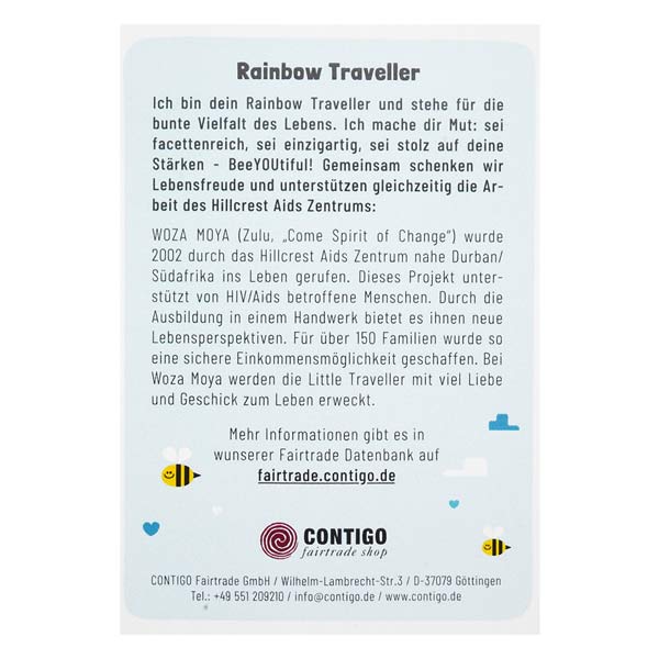 Kleine Püppchen mit großer Wirkung: Die "Little Traveller" werden von geschickten Perlenknüpfern hergestellt, die von HIV / Aids betroffen sind. Durch den Verkauf ihrer Produkte werden ihnen Einkommensmöglichkeiten eröffnet und damit Würde zurück gegeben. Die Püppchen sind Ausdruck von Hoffnung, Perspektive, Lebensmut und Verbundenheit zwischen den Menschen verschiedener Kontinente. Mit dem Kauf der kleinen Mutmacher unterstützt Du die umfangreiche Arbeit der 1991 gegründeten NGO "Hillcrest Aids Center Trust" in Durban / Südafrika.