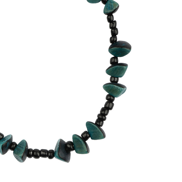 Elegantes Armband mit schwarzen Glasperlchen und sommerlich blauen Nuss Stückchen (Bits) der Buri-Palme.