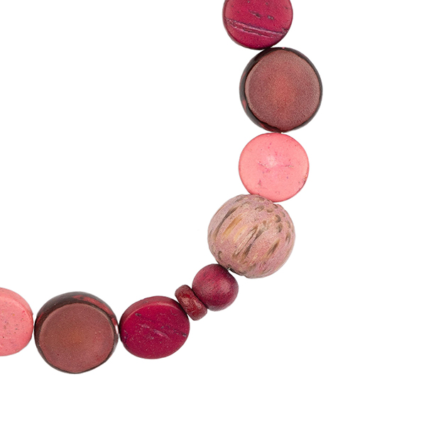 Geschmackvolles Armband mit ganzen Buri Nüssen und Kokosnuss Scheibchen in eleganten Beerentönen.
