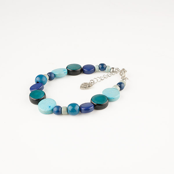 Geschmackvolles Armband mit Buri Palmnuss- und Kokosnuss Scheibchen in sanften, verschiedenen Blautönen.