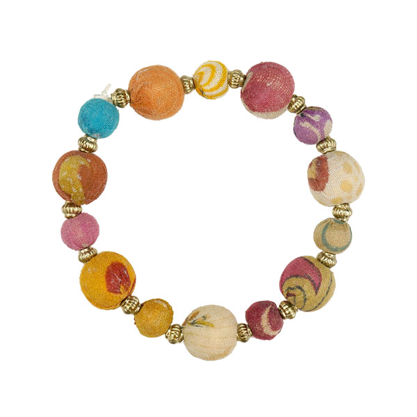 Dieses fröhliche Armband mit unterschiedlich großen Perlen aus recycelten Sari-Stoffen lässt sich perfekt mit unseren anderen Sari-Ketten und -Ohrhängern kombinieren.