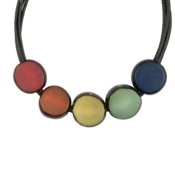 Ein Pride Statement am Handgelenk: Fröhliches Armband mit fünf Palmnuss Perlen in Regenbogen Abfolge, hergestellt aus der philippinischen Buri-Palme.