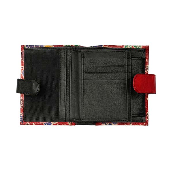 Großzügiges Münzfach, 2 Scheinfächer, 1 Reißverschlussfach, mit Innenlasche gesichert: 3 Sichtfächer im Scheckkartenformat, 8 Kartenschlitze, 1 Steckfach. komplett verschließbar durch Lasche mit Druckverschluss.