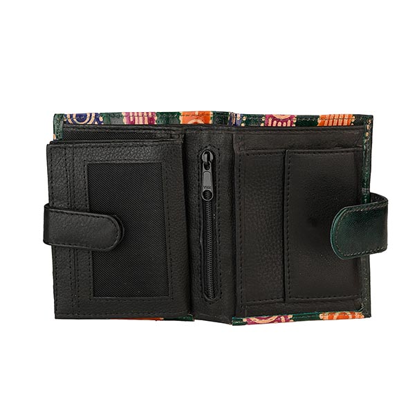 Großzügiges Münzfach, 2 Scheinfächer, 1 Reißverschlussfach, mit Innenlasche gesichert: 3 Sichtfächer im Scheckkartenformat, 8 Kartenschlitze, 1 Steckfach. komplett verschließbar durch Lasche mit Druckverschluss.