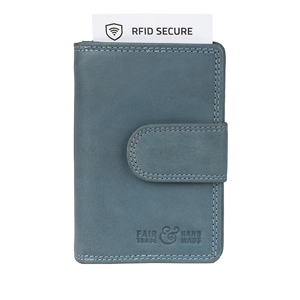 Außen: dezente Prägung Fairtrade, Münzfach mittig mit Reißverschluss, vorderes Schein- und Kartenfach mit Verschlusslasche ( 2 Druckknöpfe für Volumenerweiterung), Kartenfach rückseitig mit Druckverschluss.