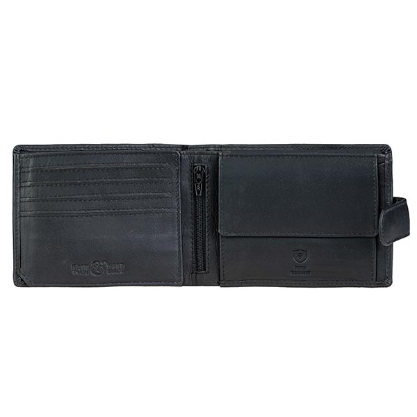 Dieses hochwertige Portemonnaie bietet reichlich Platz und zusätzlich optimale Sicherheit. Es ist mit einer RFID Schutzfolie ausgestattet, die das unkontrollierte Auslesen von Daten auf Kredit- oder Chipkarten verhindert. Eine Verschlusslasche mit Druckknopf hält die Kreditkarten sicher verwahrt.