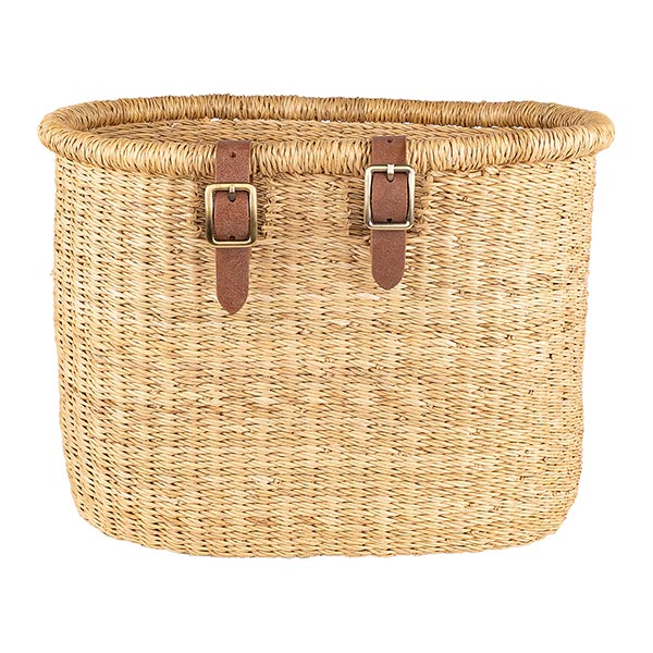 Material: Napiergras ( Elefantengras), Henkel bezogen mit vegetabil gegerbtem Ziegenleder. Kombibniert mit Lederschnallen zum Befestigen an der Lenkerstange oder dem Gepäckträger. Die Schnallen stammen von unserem Handelspartner Artisan Well aus Indien. Ein schönes Beispiel für ein gelungenen Kooperation.