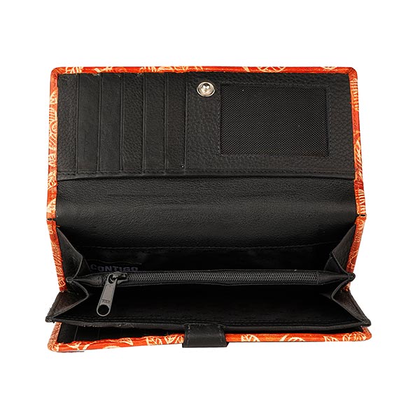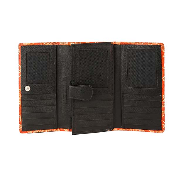 Innen: 18 Kartenfächer davon 1 Sichtfach, 4 lange Einschubfächer, dreigeteiltes Fach für Geldscheine und Münzen, ein Fachteiler mit Reißverschluss.