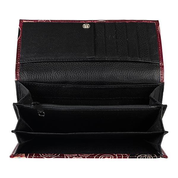 12 Kartenfächer, 1 Sichtfächer, 2 lange Einschubfächer, Druckverschluss. Separat davon zu öffnen ist ein dreigeteiltes Fach für Geldscheine und einem Münzabteil mit Reißverschluss. Dieses Fach enthält weitere 6 Kartenschlitze und 2 Schubfächer. Ebenfalls mit Druckknopf verschließbar.