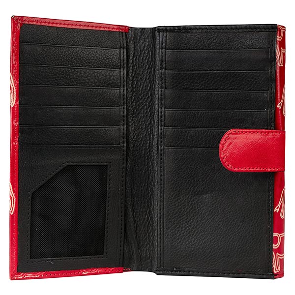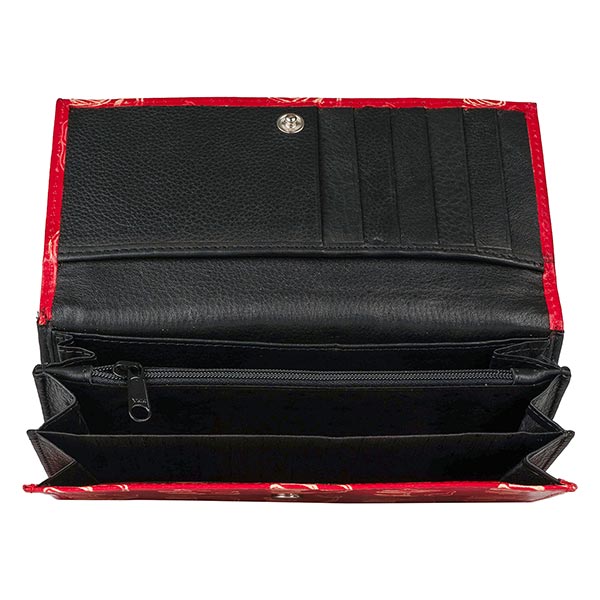 12 Kartenfächer, 1 Sichtfächer, 2 lange Einschubfächer, Druckverschluss. Separat davon zu öffnen ist ein dreigeteiltes Fach für Geldscheine und einem Münzabteil mit Reißverschluss. Dieses Fach enthält weitere 6 Kartenschlitze und 2 Schubfächer. Ebenfalls mit Druckknopf verschließbar.