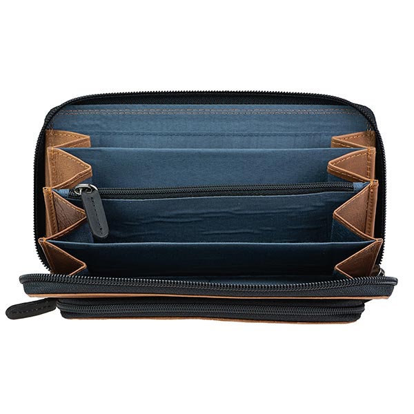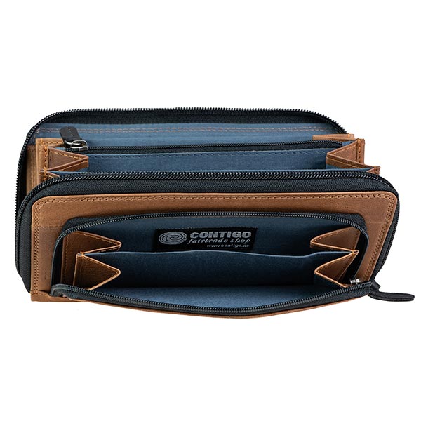 Innenausstattung: Leporelloartig, auffaltbares Innenabteil mit 4 separaten Fächern, 8 Kartenschlitzen, einem Reißverschlussmittelfach, 2 lange Schubfächer.