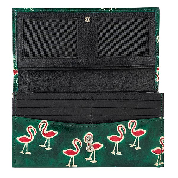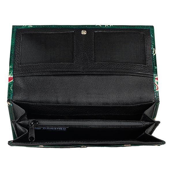 Innen: 6 Kartenfächer, 2 Sichtfächer (davon eines im Kartenformat), 3 lange Einschubfächer, zweigeteiltes Fach für Geldscheine, ein Fachteiler mit Reißverschluss.