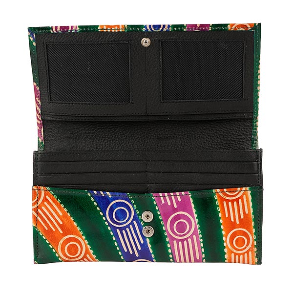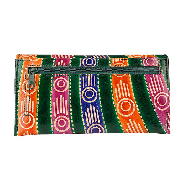 Das Besondere ist die Fertigung in traditioneller Shantiniketani-Technik. Das Leder wird geprägt und anschließend von erfahrenen Handwerkerinnen von Hand koloriert. Diese Technik wurde in den 1930er in Indien von Rabindranath Tagore (Schriftsteller und Nobelpreisträger) in Westbengalen eingeführt, um neue Einkommensmöglichkeiten im Handwerk zu schaffen.