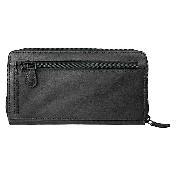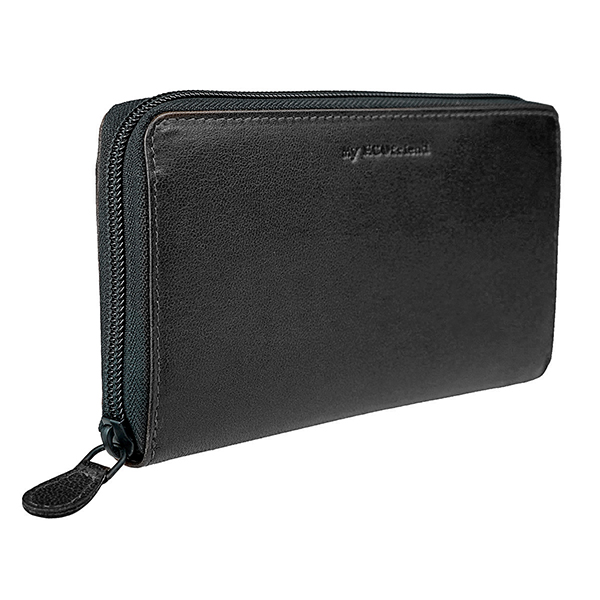 Innen: Vier offene Fächer, ein Reißverschlussfach, 2 lange Schubfächer, 8 Kreditkartenschlitze, Sichtfenster für Ausweis