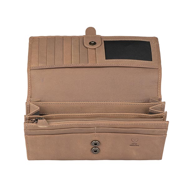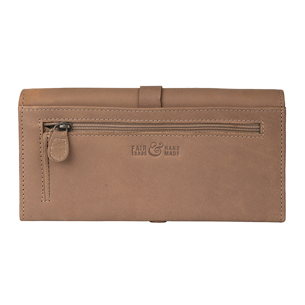 Außen: Reißverschlussfach für Münzen rückseitig, die Verschlussklappe mit 2 Druckknöpfen erlaubt ein großzügiges Befüllen der Geldbörse