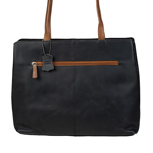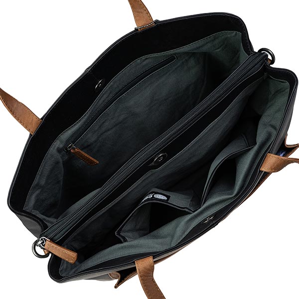 Geräumige Damentasche mit raffinierter Ausstattung. Der offene Innenraum ist durch ein mittiges Reißverschlussfach zweigeteilt und schließt mit einem Magnetverschluss. Hier kann Frau bequem Ordnung halten. Auch DIN A4 Formate finden problemlos Platz. Die beidseitig außen angebrachten Staufächer sind gut zugänglich und mit Reißverschlüssen sicher verschlossen. Sie erlauben den schnellen Zugriff auf Schlüssel, Handy und Portemonnaie. Zwei Tragegriffe und ein abnehmbarer Gurt gehören zur Ausstattung.