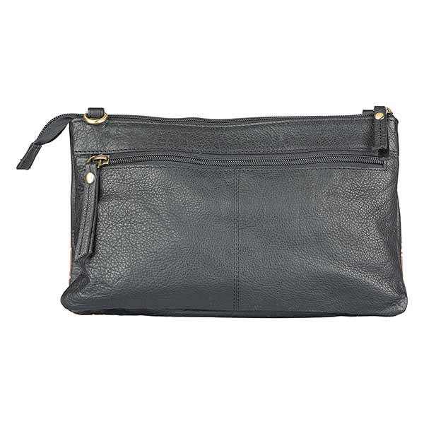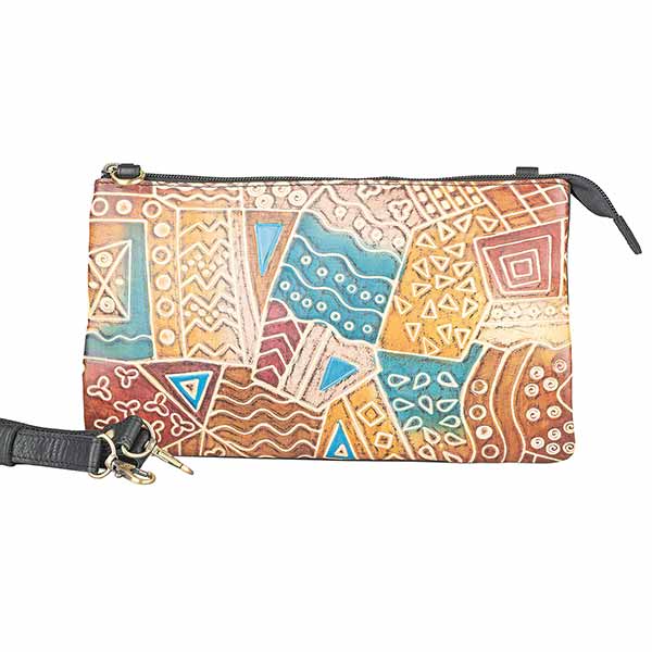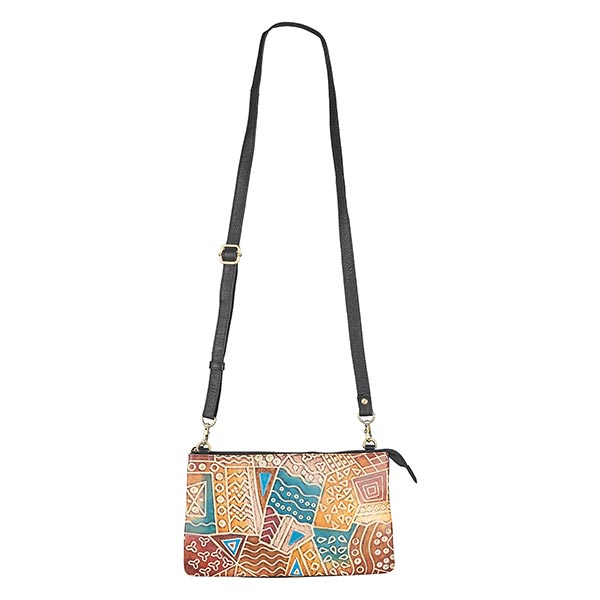 Praktisch aufgeteilte kleine Schultertasche aus Ziegenleder in traditioneller Shantiniketani-Technik koloriert. Ein anschmiegsames Modell, das auch ohne Gurt als Clutch getragen werden kann.