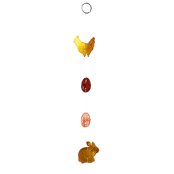 Diese frühlingshafte Fenster-, Tür- oder Raumdekoration aus schimmernder Capizmuschel in warmen Tönen und österlichen Motiven (Hasen, Hühner, Eier) lässt Vorfreude auf sonnige Tage aufkommen. Der Strang besteht aus 13 Elementen und wird liebevoll auf den Philippinen von Hand gefertigt.