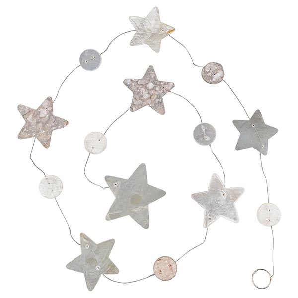 Weihnachtliche Fenster-, Tür- oder Raumdekoration aus schimmernder Capizmuschel in weiß-silber. Der Sternenstrang mit 14 Elementen wird liebevoll auf den Philippinen von Hand gefertigt.