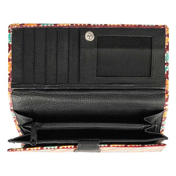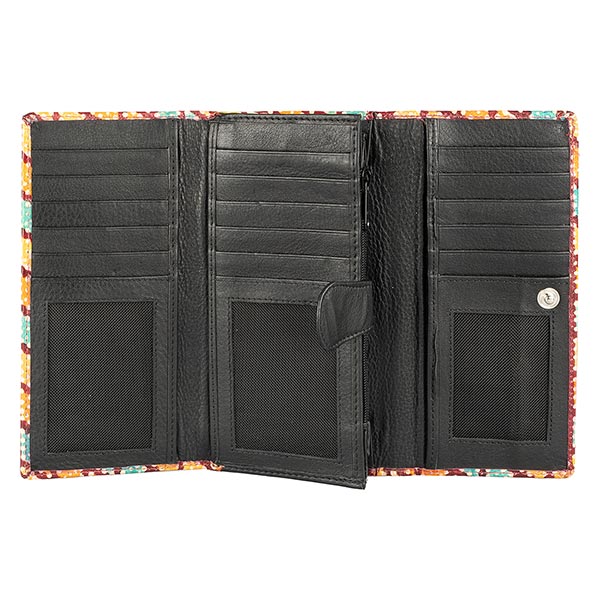 Innen: 18 Kartenfächer davon 1 Sichtfach, 4 lange Einschubfächer, dreigeteiltes Fach für Geldscheine und Münzen, ein Fachteiler mit Reißverschluss.