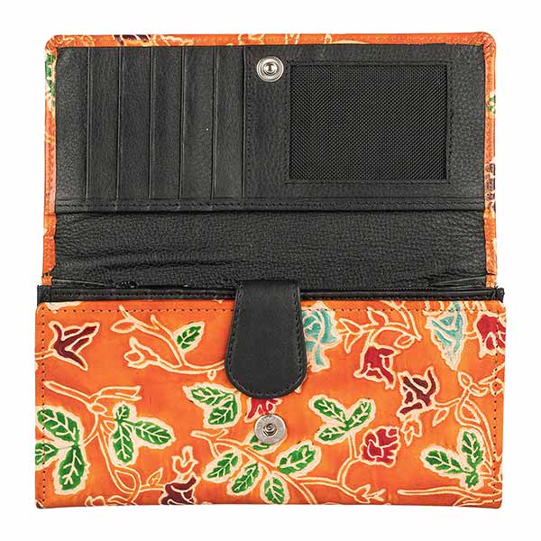 Das Besondere ist die Fertigung in traditioneller Shantiniketani-Technik. Das Leder wird geprägt und anschließend von erfahrenen Handwerkerinnen von Hand koloriert. Diese Technik wurde in den 1930er Indien von Rabindranath Tagore (Schriftsteller und Nobelpreisträger) in Westbengalen eingeführt, um neue Einkommensmöglichkeiten im Handwerk zu schaffen.