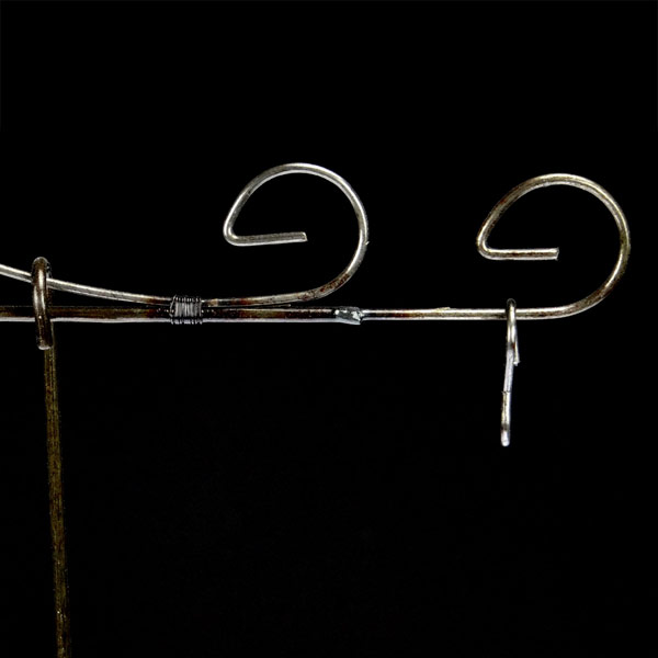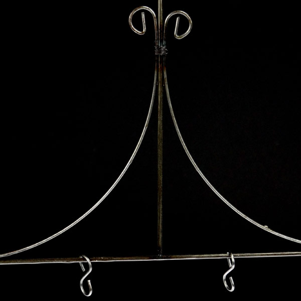 Display zur Präsentation der Glasdekorationen und Glaskugeln bestehend aus einer dekorativen Drahtaufhängung und einem einhakbaren Gitter, wir liefern mit: kleine S- Haken. Gesamthöhe 66cm, Breite 50cm. Im Laden können so auf engstem Raum die verschiedenen Modelle hängend präsentiert werden.