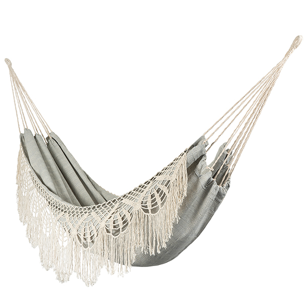 Diese Doppelhängematte ist ein wahres Prachtstück und eine Kooperation der Nachbarländer El Salvador und Guatemala. Frauen im Bergland von Chalatenango knüpfen die schmuckvolle Makramee-Borte. Der schwere Webstoff besteht aus naturbelassener Baumwolle und Recyclinggarn aus der Jeansfabrikation, er wird ebenfalls in Guatemala gewoben. Handwerker in El Salvador fügen alles zu einem Hängemöbel der Extraklasse zusammen. Ein Modell, das traditionelle Textilkunst und modernes Design zusammenbringt. Ein Entspannungsmöbel, das gut in den jungen Wohntrend im nordischen Stil passt. Ein Modell für die Nutzung indoor oder outdoor.