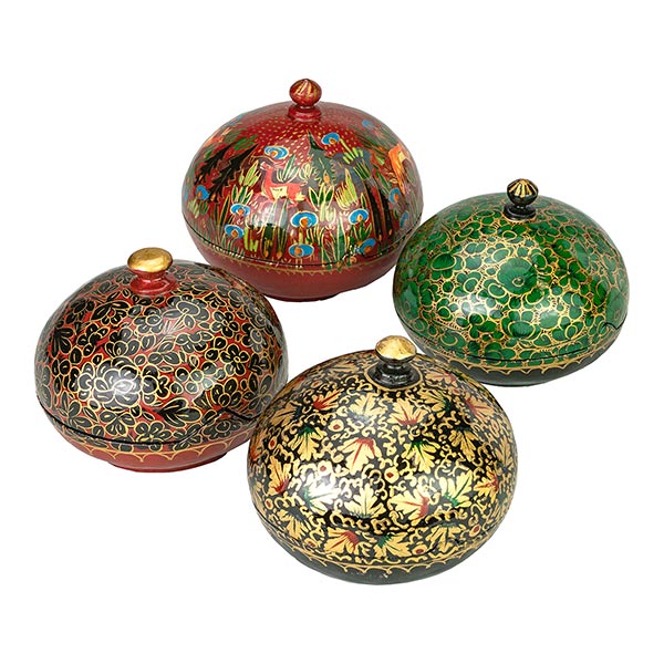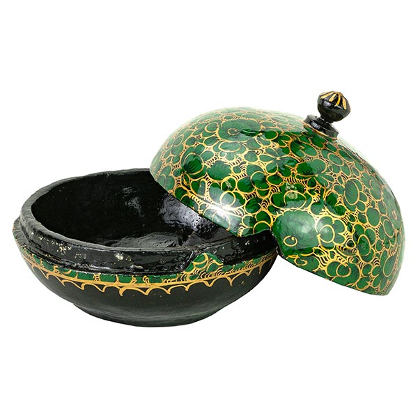 Tolle runde Dose aus Pappmaché mit Griff, handbemalt in bunten Farben und vielfältigen Blumenmustern vom kleinen Familienbetrieb Jalaluddin in der Region Kaschmir in Nordindien. Altpapier wird für diese Dosen zerkleinert, mit Kleister und Wasser vermischt und in Form gebracht getrocknet. Danach werden die Dosen mit Lack beschichtet und in den aufwändigen, traditionellen Mustern von Hand verziert.