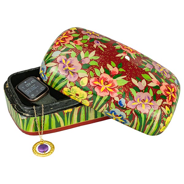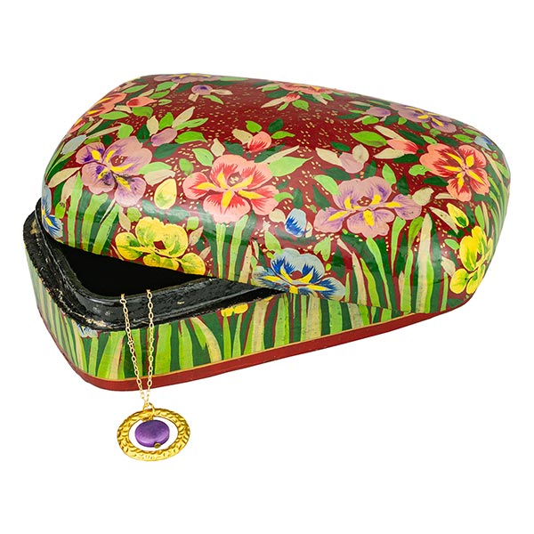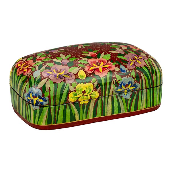 Tolle Dose aus Pappmaché, handbemalt in bunten Farben und vielfältigen Blumenmustern vom kleinen Familienbetrieb Jalaluddin in der Region Kaschmir in Nordindien. Altpapier wird für diese Dosen zerkleinert, mit Kleister und Wasser vermischt und in Form gebracht getrocknet. Danach werden die Dosen mit Lack beschichtet und in den aufwändigen, traditionellen Mustern von Hand verziert.