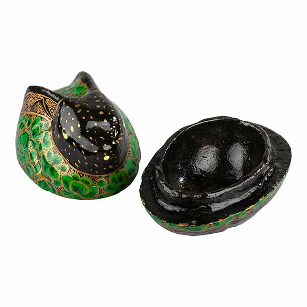 Niedliches Döschen aus Pappmaché, handbemalt in bunten Farben und vielfältigen Blumenmustern vom kleinen Familienbetrieb Jalaluddin in der Region Kaschmir in Nordindien. Altpapier wird für diese Dosen zerkleinert, mit Kleister und Wasser vermischt und in Form gebracht getrocknet. Danach werden die Dosen mit Lack beschichtet und in den aufwändigen, traditionellen Mustern von Hand verziert.
