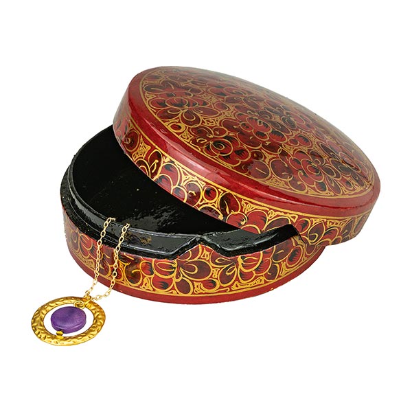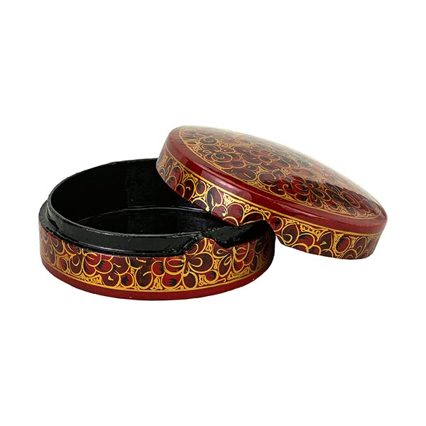 Tolle kleine, runde Dose aus Pappmaché handbemalt in bunten Farben und vielfältigen Blumenmustern vom kleinen Familienbetrieb Jalaluddin in der Region Kaschmir in Nordindien. Altpapier wird für diese Dosen zerkleinert, mit Kleister und Wasser vermischt und in Form gebracht getrocknet. Danach werden die Dosen mit Lack beschichtet und mit den aufwändigen, traditionellen Mustern von Hand verziert.