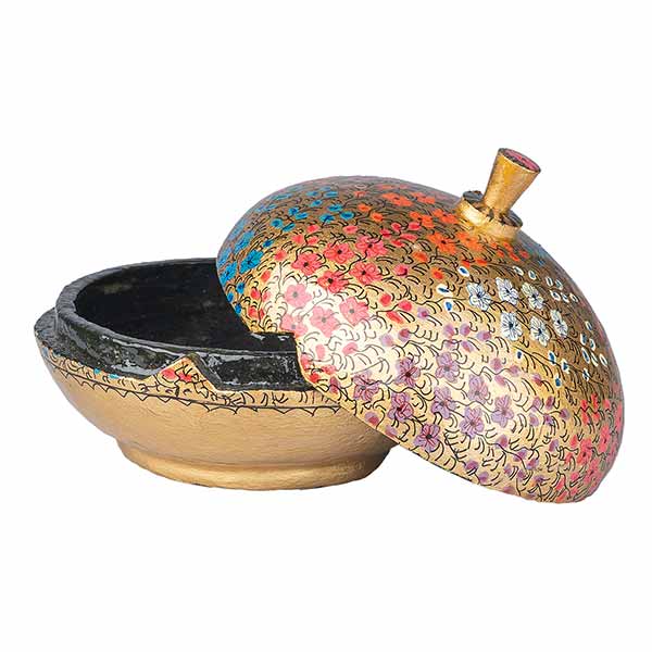 Tolle Dose aus Pappmaché, aufwändig und kunstfertig handbemalt in bunten Farben und vielfältigen Blumenmustern vom kleinen Familienbetrieb Jalaluddin in der Region Kaschmir in Nordindien.