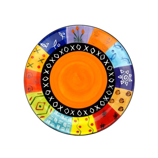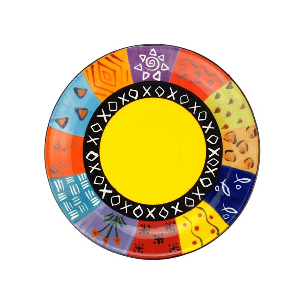 Von Hand gearbeiteter Frühstücks- oder Kuchenteller für Ihr Tafelservice. Flacher Teller von ca.19,5cm Durchmesser. Unterglasur Design: handbemalt mit afrikanisch inspirierten Motiven. Es gibt viele Varianten innerhalb einer Farbfamilie, gelieferter Artikel kann von der Abbildung abweichen.Material: hochwertiges Steinzeug aus weißem Ton, Glasurbrand bei 1.200°CEigenschaften: mikrowellengeeignet, für Lebensmittel geeignet.Empfehlung: handgemachte Keramik ist stoßempfindlicher als Industriekeramik. Die Standfläche der Keramik ist nicht glasiert. Wir empfehlen die schonende Reinigung durch Handabwasch.