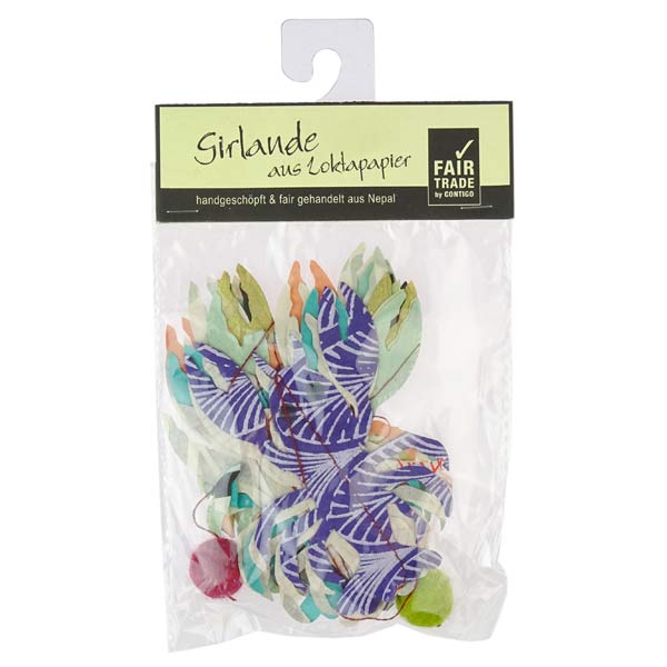 Die liebevoll von Hand gefertigten Girlanden aus Loktapapier verschönern jeden Raum und Anlass! Die Farben und Designs sind immer nach dem aktuellen Sortiment zusammengestellt, jede Girlande variiert etwas von der Abbildung. Zur leichteren Aufhängung und Beschwerung sind an beiden Girlandenenden farbenfrohe Filzkugeln befestigt. Lokta, die Rindenfaser des Seidelbastes, wird im Himalaya von Dorfgemeinschaften geerntet und in kleinen Papiermanufakturen nach alter Tradition zu Papier verarbeitet. Das handgeschöpfte Loktapapier hat eine besonders weiche, stoffähnliche Haptik. Es kann mit verschiedensten Techniken gefärbt und gestaltet werden.