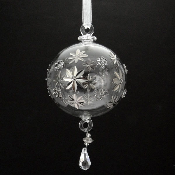 Klassische, festliche Dekoration für die Advents- und Weihnachtszeit. Die lampengeblasenen Glaskugeln und Zapfen werden von Hand hergestellt und mit filigranen Mustern verziert und bemalt.Durchmesser: 7cmFarbe: transparent, silberSonstige Merkmale: Weißes Chiffonband zum Aufhängen.HINWEIS: Design und Größe können leicht von der Abbildung abweichen.