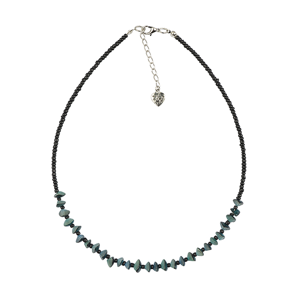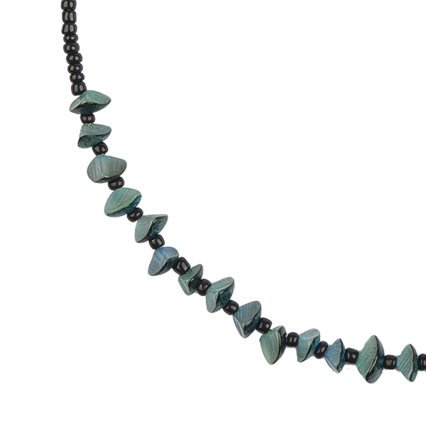 Einreihige Halskette mit schwarzen Glasperlchen und blau-grünen Nuss Stückchen (Bits) aus den Samen der philippinischen Buri-Palme. Unser langjähriger Handelspartner SHINE widmet sich der Herstellung von Schmuck aus lokal verfügbaren Naturmaterialien. Die Buri-Palme blüht nur einmal gegen Ende ihres Lebens (nach etwa 70 Jahren) und bildet danach den weltweit größten Fruchtstand mit mehr als 10.000 Samen. Nach der Ernte werden diese zu hübschen Perlen weiterverarbeitet.
