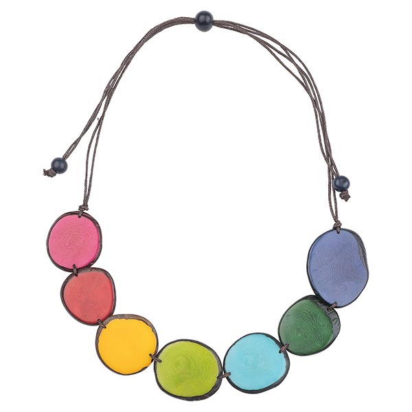 Diese hinreißende einreihige Halskette mit 7 Elementen aus Taguascheiben erstrahlt in den Farben des Regenbogens und ist der perfekte Begleiter für die warme Jahreszeit.