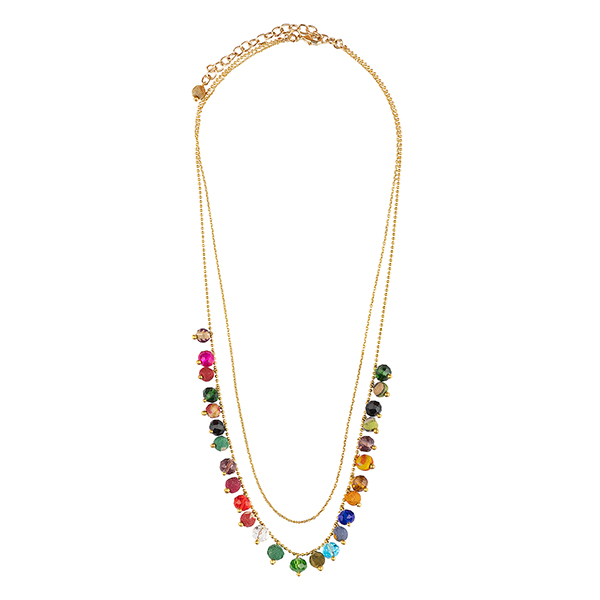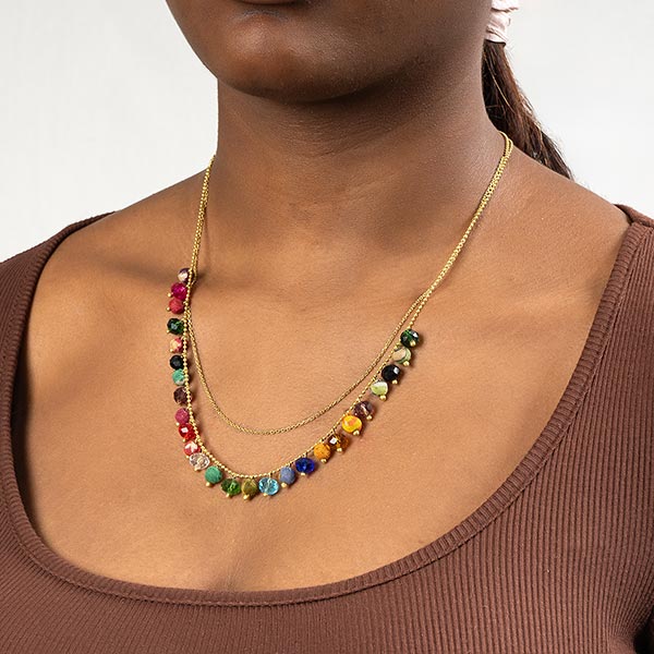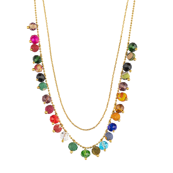 Bei dieser dezenten Halskette wechseln sich Perlen aus recycelten Sari-Stoffen und geschliffene Kunststoffperlen ab. Die zweite Messingkette sorgt für den Extra Pfiff!