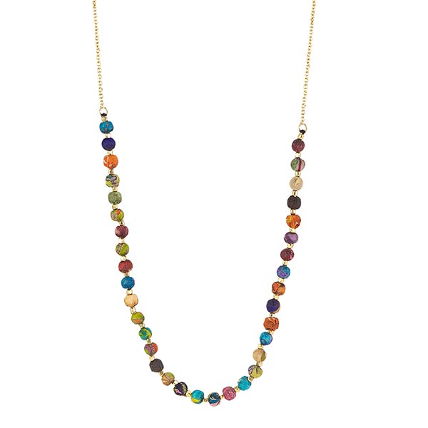 Diese stilsichere Halskette mit Perlchen aus recycelten Sari-Stoffen lässt sich perfekt mit unseren anderen farbenfrohen Sari-Ohrhängern und -Armreifen kombinieren.